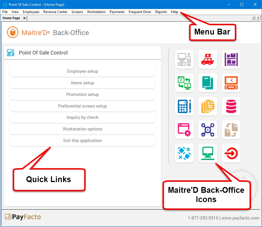 All Maitre'D modules share the same general layout allowing users to quickly navigate through the modules. A menu bar in the top part of the window displays all the tasks and functions that can be performed using the POS Control module. The center pane is divided into two parts. The right hand side contains the same icons as the Maitre'D Back-Office main screen and allows users to open another module directly from the Point of Sale Control module. The left hand side contains a series of links to the most common tasks performed using the Point of Sale Control.