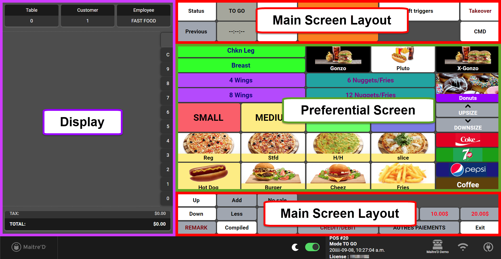 Maitre'D screens are the interface that allows POS users to interact with the Maitre'D POS system. They allow ordering of sales items and perform all the operations required to run a successful restaurant business. Different screens can be assigned to each employee based on their functions and responsibilities in the restaurant, and screens can change automatically based on modes and revenue centers.