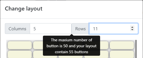 If the maximum of 50 buttons per screen is exceeded, a warning will be displayed on the screen. Reduce the number of rows or columns to bring the number of buttons to 50 or less.