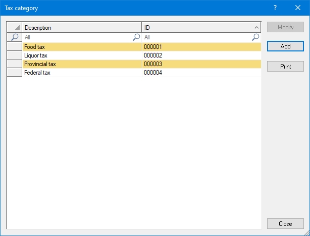 Click the Print button to generate a report with the complete list of Tax Categories, which can then be printed.