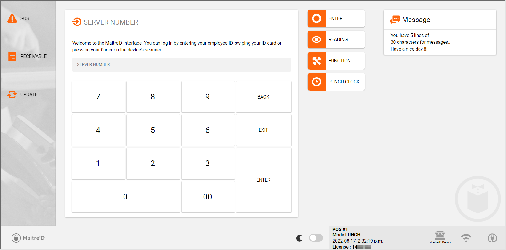 Windows logon screen The POS software should start by itself. On the first start, the POS could take longer to start as it downloads files from the Maitre'D Back-Office server. Eventually, the POS home screen will be displayed.