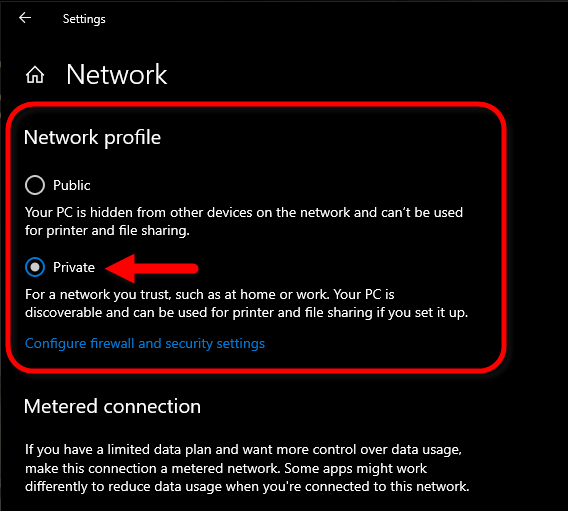 Ethernet - Basic Settings Under the Private (or domain) profile, make sure that: