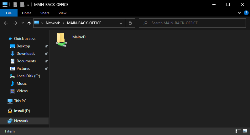 a. If the Maitre'D Back-Office is already installed, you will see the MaitreD shared folder on the PC named MAIN-BACK-OFFICE.