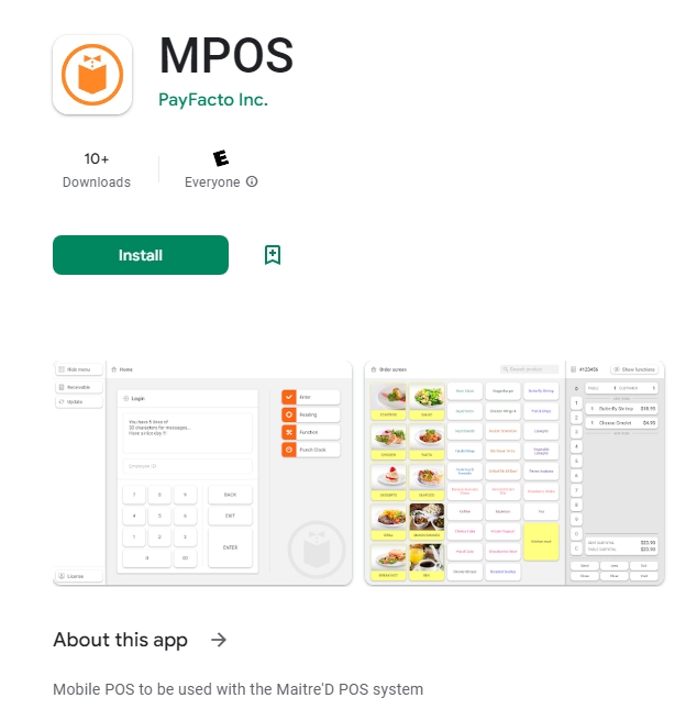 The Maitre'D Mobile POS (MPOS) application is available on Google Play.