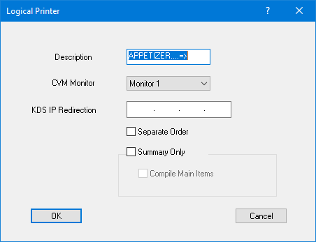 Type a meaningful description for the logical printer. For example, if the printer is used at the appetizer prep station, it may be called "Appetizers"