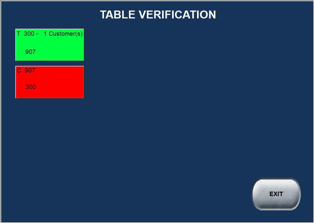 The TABLE VERIFICATION screen appears. Press the GREEN box if you wish to access the bar tab to add or void items. Press the RED box if you wish to print the check and close the bar tab immediately.