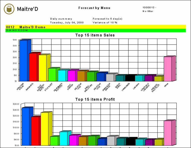 Maitre'D's items Forecast by Revenue Center report shows you your forecast sales and profit per Revenue Center for the specific amount of days and variance needed. From the report filter window, you select the appropriate date selection, category, division, Revenue Center, mode and amount of days to include and variance needed. The graphic is divided in 2 sections: top 15 items sales and top 15 items profit. The first section provides you with the items with highest sales and the second one provides you with the items with the highest profit. Take note we only show the top 15 items. The following is a sample of the items forecast by Revenue Center report: