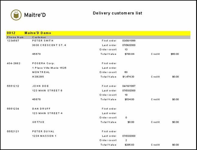 Maitre'D customer report provides you with a list of all delivery customers. It gives the customer's telephone number and address, the date of the customer's first order, the date of the last customer's order, how many orders and the $ value since the customer's first order and if any credit is available in the customer's account.