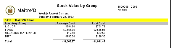 Maitre'D stock value by group report shows you both how much your stock has cost you, as well as how much it is worth now, divided by inventory groups. From the report filter window, select the time period to be included in the report. The following is a sample of the stock value by group report: