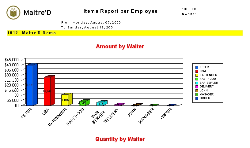 Maitre'D item report per employee shows the total $ amount sold for each employees and the number of items with the description