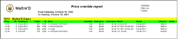 Maitre'D price override report provides all items ordered for a specific time frame. From the report filter window, select the date and time range, tables and employees to be included in the report. The following is a sample of the price override report: