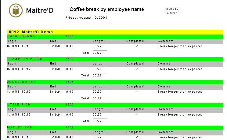 Maitre'D coffee break by employee name report shows each employee break and its length. The report lets you know if the employee is still in its coffee break and if not, the report shows a comment to let you know if it was shorter or longer than your T&A pre-defined coffee break time. The report is sorted by employee name.