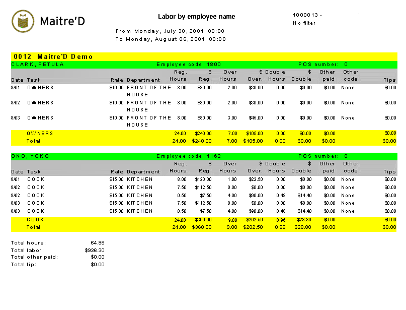 Maitre'D labor by employee name report shows detailed information such as the regular hours, overtime, and double hours of the employees and the payable salary related to it. This report is sorted by T&A employee name. From the report filter window, select the appropriate week or custom date to be included in the report.