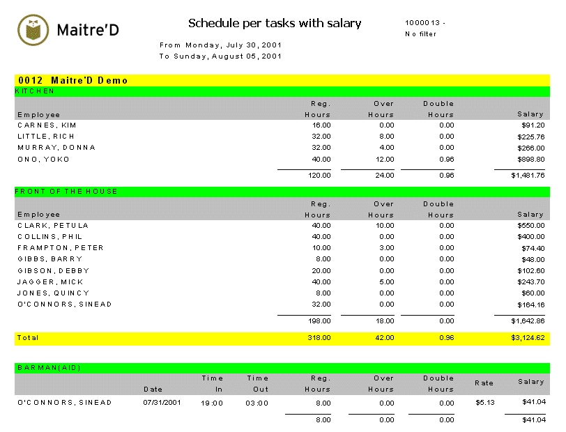 Maitre'D schedule per task with salary report shows information on the scheduled hours for each T&A department with the employee name, assigned hours and payable salaries for the current week or the next week. It gives you each employee's schedule with his or her payable salary sorted by task From the report filter window, select the current week or next week and the employee(s) to be included in the report.