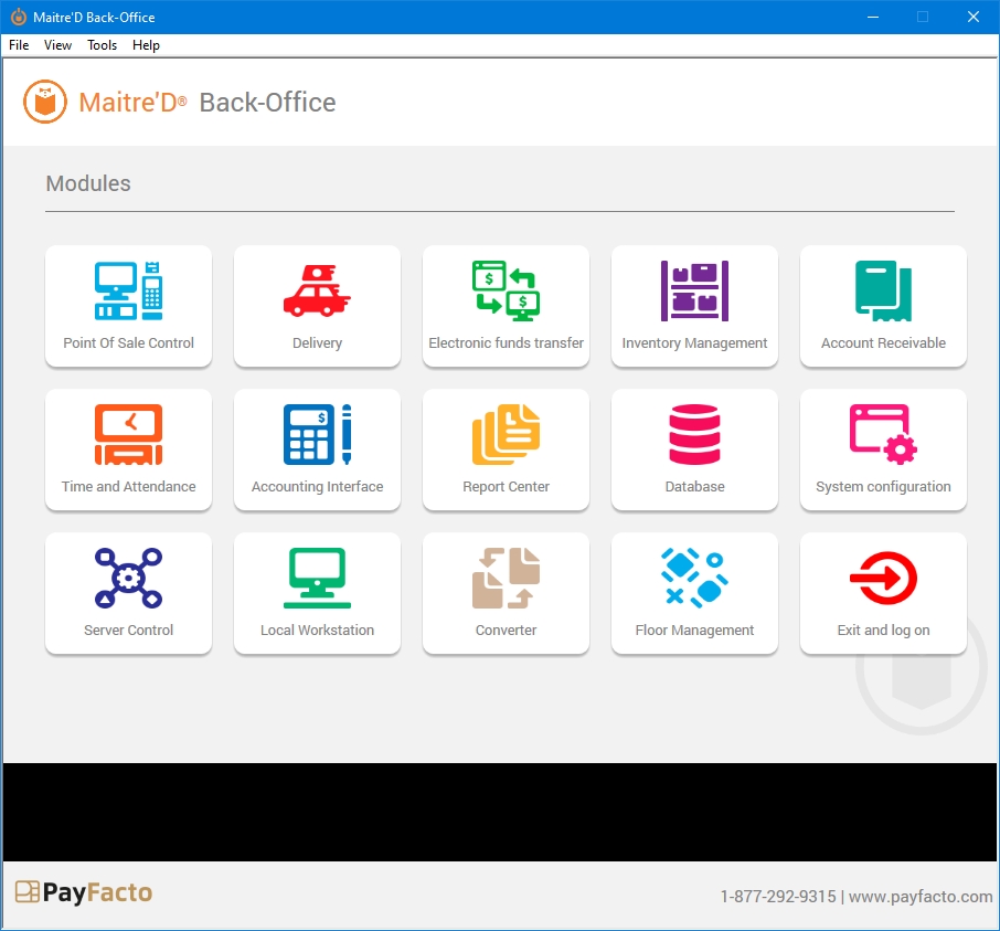 Below is a short description of every module and option that can appear on the Maitre'D Main Back-Office Desktop. For more information on a specific module, please consult the documentation specific to that module.