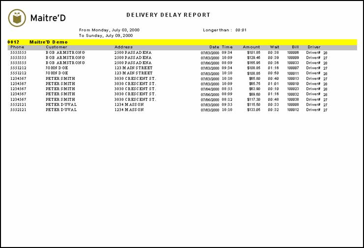 Maitre'D delay report provides you information based on the waiting time. The waiting time is the time between the customer calls and the time the customer receives the order. This report is available if you are using the "Delivery Driver" and "Historical" options from the Delivery module. The customers are sorted in an alphabetical order. From the report filter window, select the appropriate starting delay time and date range to be included in the report.
