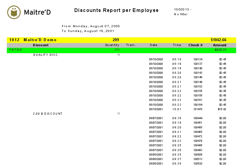 Maitre'D's Discount report per employee report, provides you with a list of all discounts made per employee for the selected date or date range. It gives the date and time the discount was applied to the check. From the report filter window, select the appropriate date and date range, promotion (discount) and employees to include in the report.