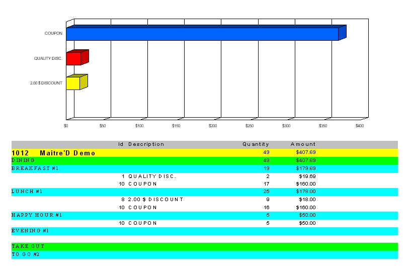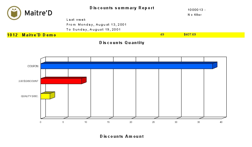 Maitre'D's Discount summary report provides you with a list of all discounts made for the selected date range. It gives the description, the number of discount and the amount the discount was applied. From the report filter window, select the appropriate date range, Revenue Center, mode, division, categories and promotion (discount) to include in the report.