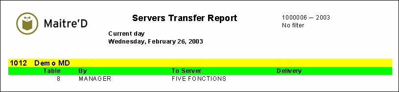 Maitre'D servers transfer report provides you with a list of all items transfer done from one server to another for a selected date or period of time. From the report filter window, select the appropriate date and employees to be included in the report. The following is a sample of the servers transfer report: