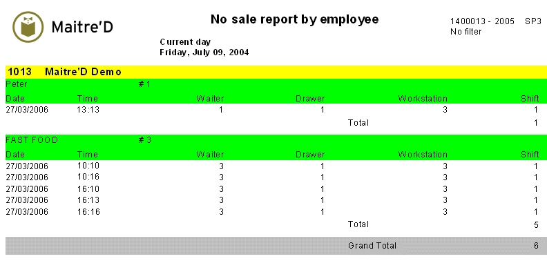 Maitre'D's No Sales reports print the number of times cash drawers were opened without a transaction. The following is a sample of the no sales by employee report:
