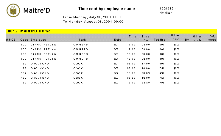 Maitre'D time card by employee name report shows information regarding the clocking time of the employees along with their tasks and other pays, and the POS supervisor number that made any editing along with any reasons. A legend is shown at the end of the report to help you retrieve an adjustment reason or other code. This report is sorted by T&A employee name. From the report filter window, select date or date range and employee(s) to be included in the report.