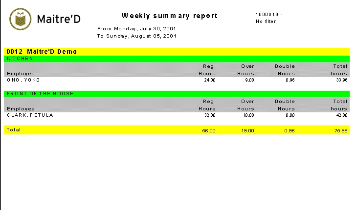 Maitre'D weekly summary report shows information on worked hours for each T&A department for a specific week or date range. It details each employee name with its worked hours for each T&A department. From the report filter window, select the appropriate week or custom date, the employee(s) and T&A department to be included in the report.