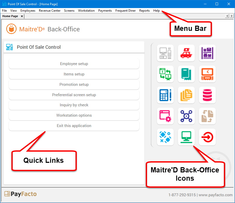 All Maitre'D modules share the same general layout allowing users to quickly navigate through the modules. A menu bar in the top part of the window displays all the tasks and functions that can be performed using the POS Control module. The center pane is divided into two parts. The right hand side contains the same icons as the Maitre'D Back-Office main screen and allows users to open another module directly from the Point of Sale Control module. The left hand side contains a series of links to the most common tasks performed using the Point of Sale Control.