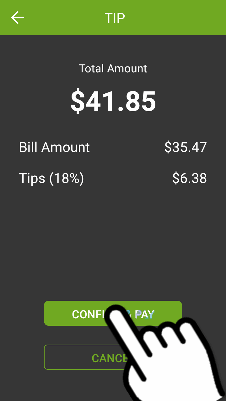 The tip confirmation screen is an extra step which allows the customer to review the details of the payment in a clear, minimalist display, without any other distractions on the terminal screen.