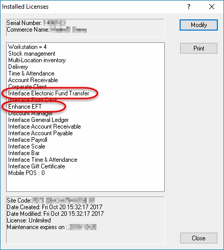 Make sure that the Maitre’D Electronic Funds Transfer Interface and Enhanced EFT options are included on the Maitre’D license. To confirm this, simply logon to the Maitre’D Back-Office using appropriate credentials, click on the File menu and select the Licenses option.