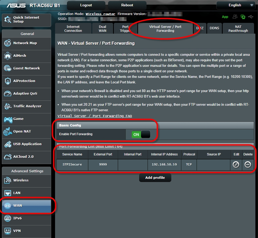 In this task, we will configure Port Forwarding on a router/firewall device to allow SecureTable to communicate with the POS system through the STPI Client while delivery drivers are on their delivery routes. The device used in this tutorial is an Asus RT-AC66U B1 wireless router and firewall. While the exact settings and menus will differ between models and manufacturers, the general principles are the same.