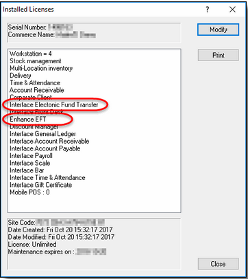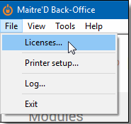 Make sure that the Maitre’D Electronic Funds Transfer Interface and Enhanced EFT options are included on the Maitre’D license. To confirm this, simply logon to the Maitre’D Back-Office using appropriate credentials, click on the File menu and select the Licenses option.