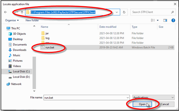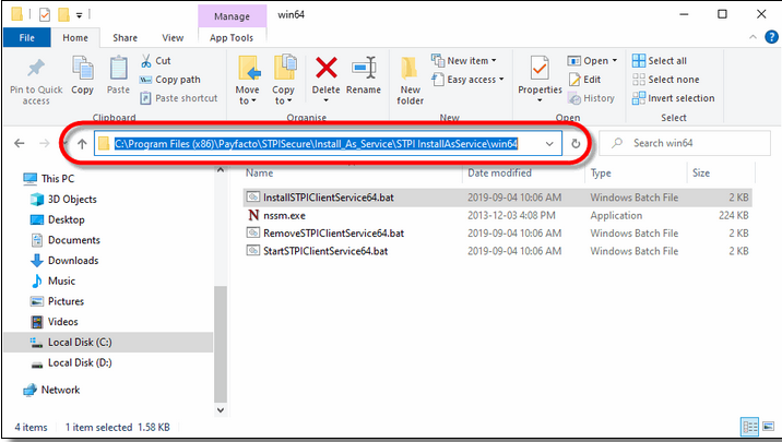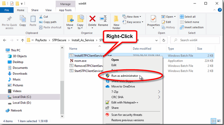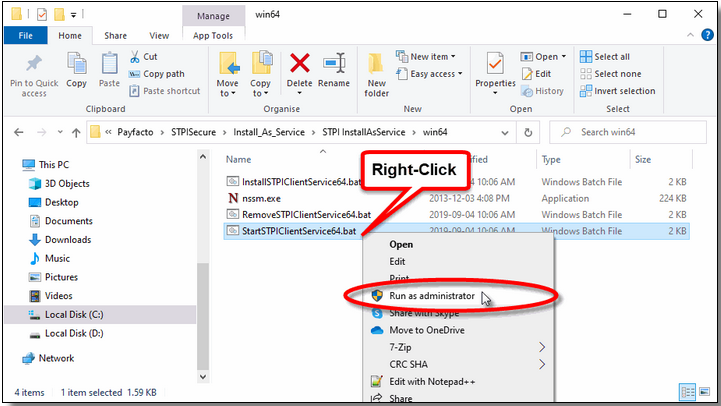 9. Locate the file called StartSTPIClientService64.bat (for 64-bit Windows) or StartSTPIClientService32.bat (for 32-bit Windows). Right-click the file and select Run as administrator.