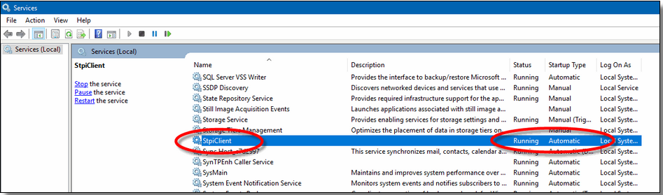 From there, make sure that the STPIClient service is running by looking at the Windows services as described above.