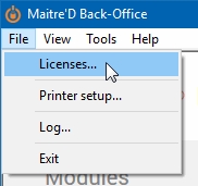 Make sure that the Maitre’D Electronic Funds Transfer Interface option is included on the Maitre’D license. To confirm this, simply logon to the Maitre’D Back-Office using appropriate credentials, click on the File menu and select the Licenses option.