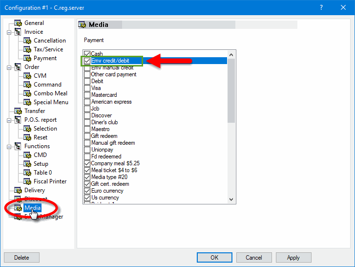 Enable the Credit / Debit media type, as well as any other media type required by this employee configuration, such as Cash, Gift Cards, foreign currencies, Room Charge, etc.