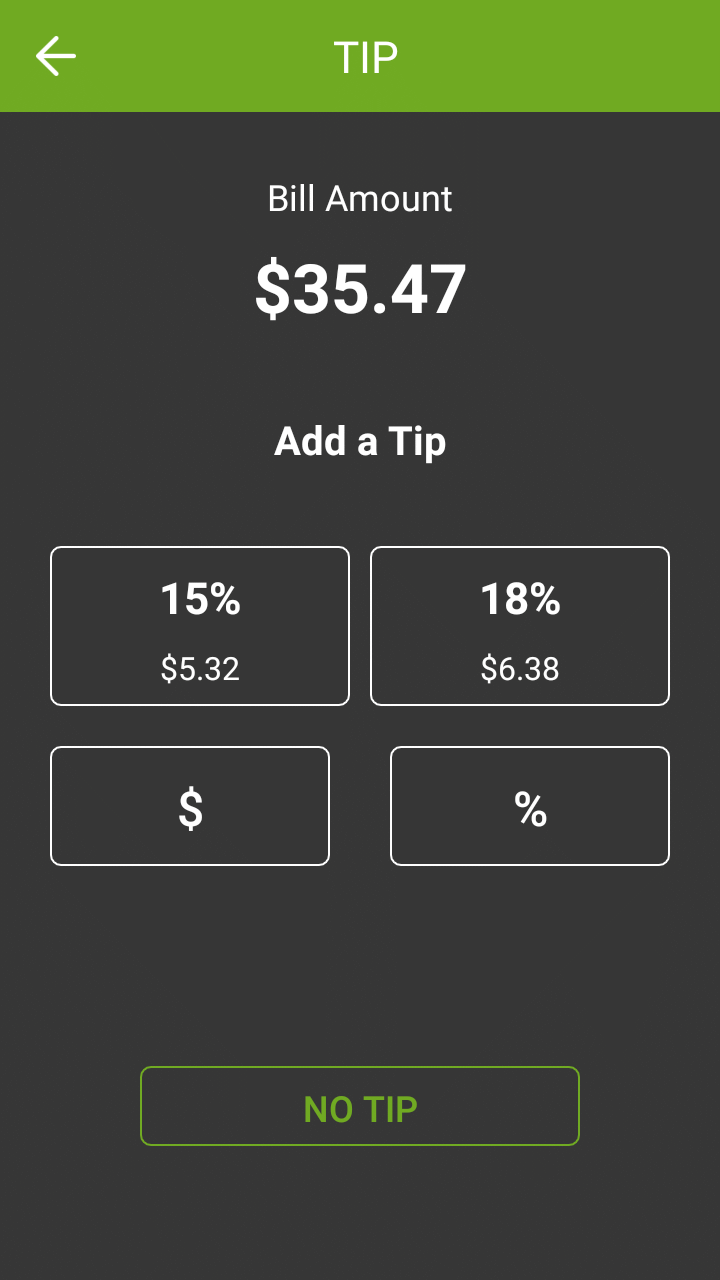 With the tip confirmation option enabled, the customer is presented with the detailed calculation of the tip. This screen also allows the customer to quickly back track and make corrections using the Back (