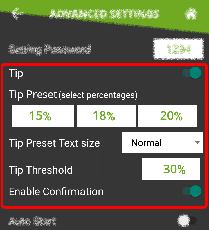 Enter the maximum allowed tip percentage. Any tip amount that exceeds this percentage will require the settings password to be entered. Setting the percentage to 0% disables the tip threshold validation.
