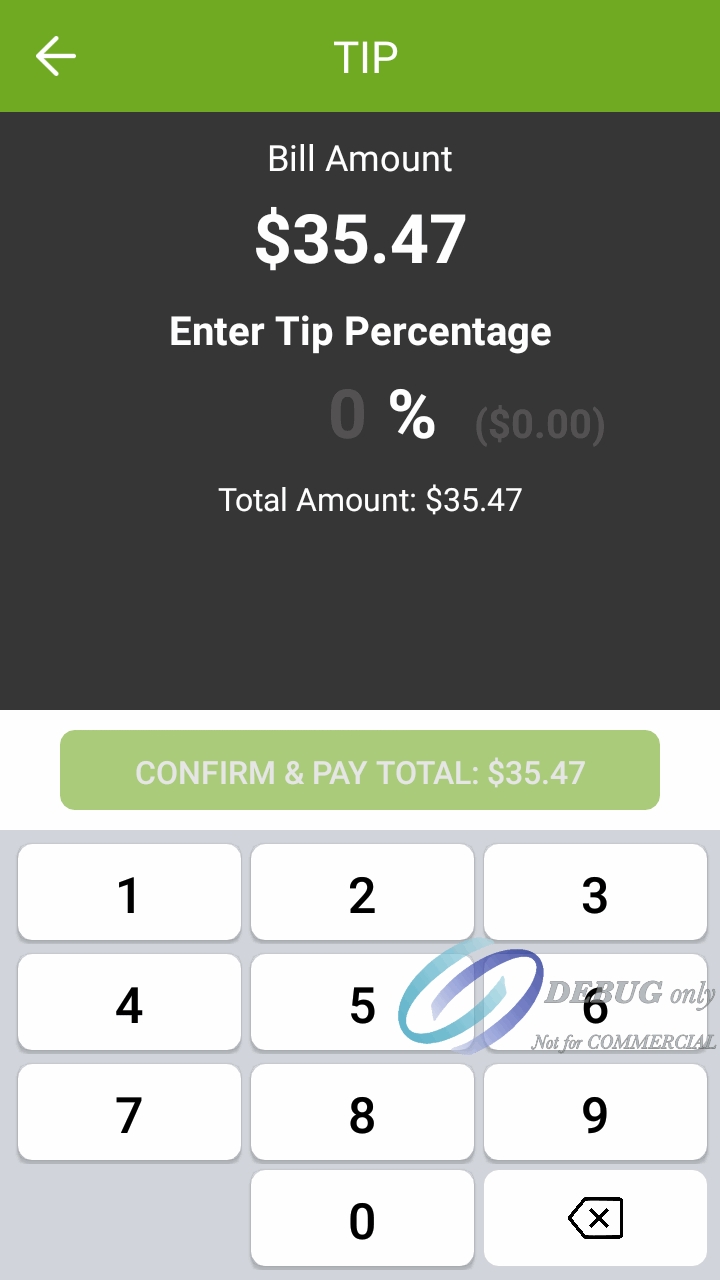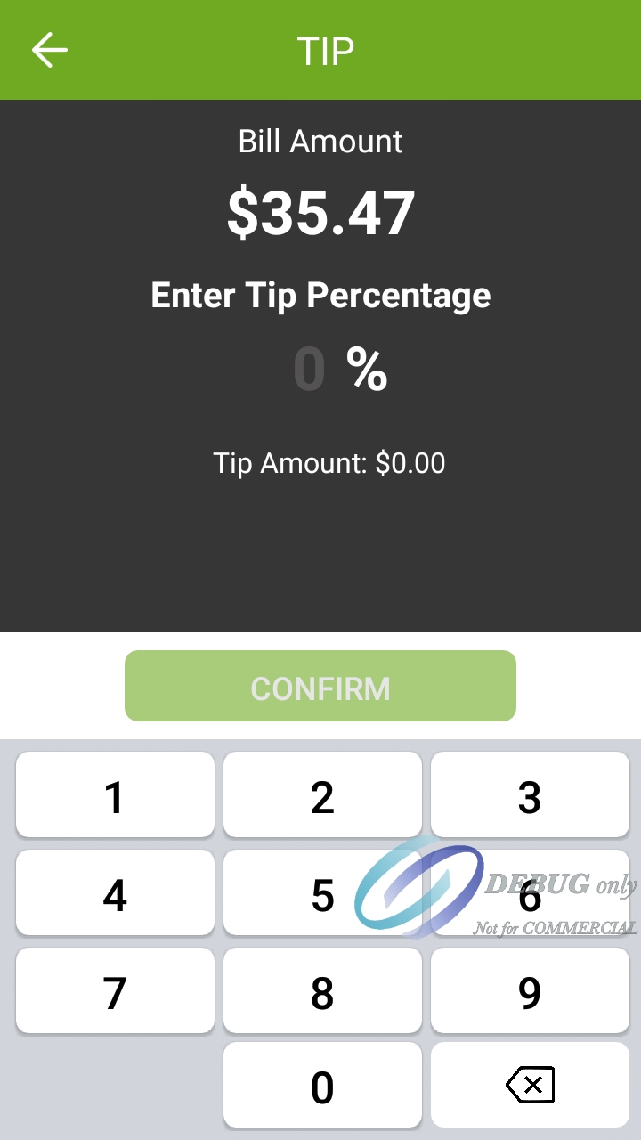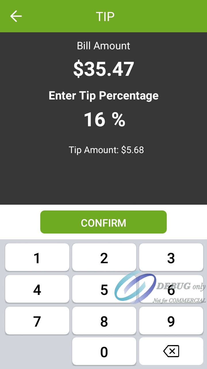 The screenshots below illustrate the differences in the custom tip percentage screen when tip confirmation is enabled or disabled. Notice how the screen with confirmation disabled shows more information. This is to compensate for the absence of the dedicated confirmation screen.