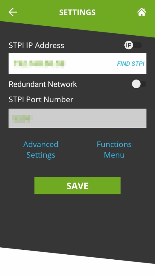 By default, the toggle switch is set to IP, and the field is labeled STPI IP Address. By touching the toggle switch, the field will change to STPI URL Address.