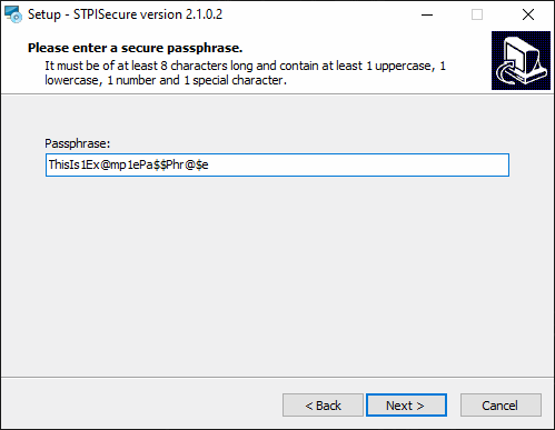 NOTE: The passphrase must be at least 8 characters long and contain at least 1 uppercase letter, 1 lowercase letter, 1 number and 1 special character. The Next> button will remain grayed-out (inactive) until those requirements are met.