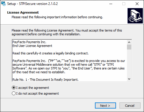 3. Please read the End-User Licence Agreement. If you agree with the terms, select I accept the agreement and click Next>.
