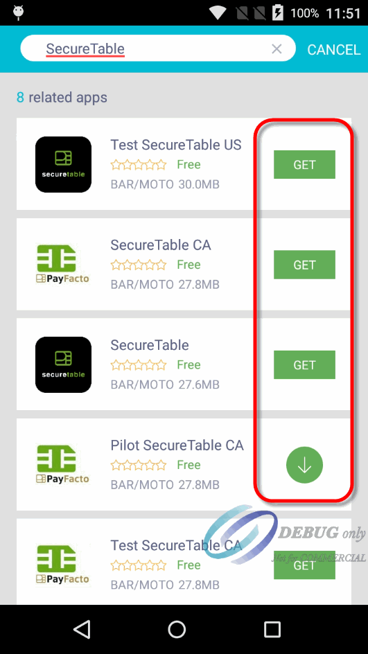 After the STPISecure client is installed, configured and running properly on the POS system, make sure that all payment terminals are properly configured so they can communicate with the POS system. Android payment terminals are generally shipped with all the necessary applications pre-installed by PayFacto, including the latest versions of SecureTable and of the latest version of the Payment application. If the SecureTable application appears to be missing, install it using the instructions below.