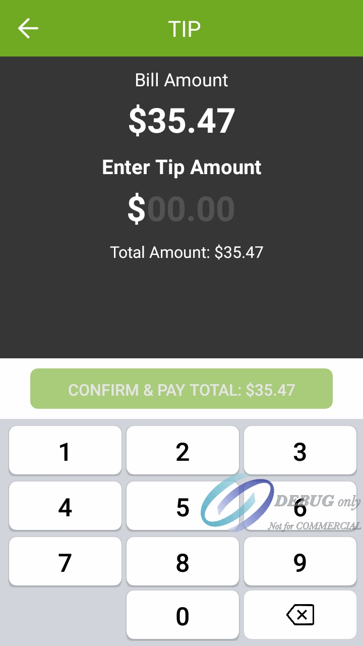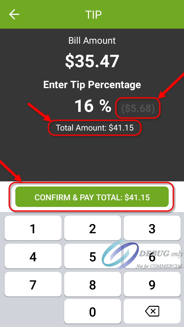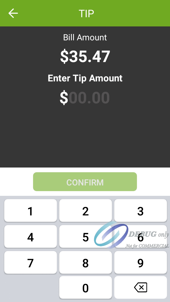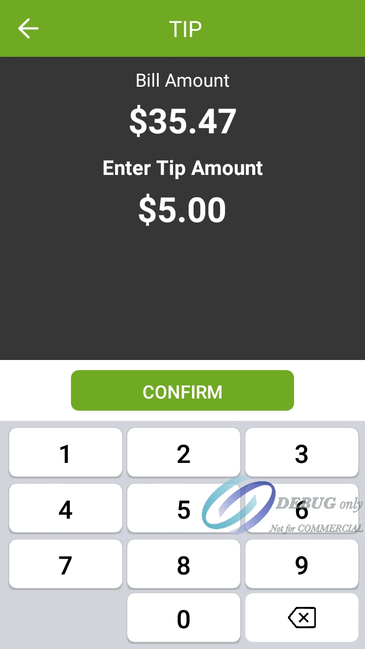 The screenshots below illustrate the differences in the custom tip amount screen when tip confirmation is enabled or disabled. Notice how the screen with confirmation disabled shows more information. This is to compensate for the absence of the dedicated confirmation screen.