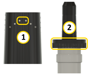 To secure the stoppers in place and ensure proper operation of the Velmix LQ, you need to install seals on the bottles. Each seal is fitted with vent holes (1) and must be positioned so that the vent holes are aligned with the stopper's fly guard (2).
