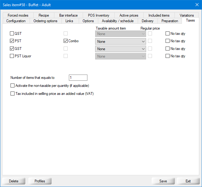 Enable this option for the PST tax only, on all regular items that are combos, but only if they include a soda item which cannot be purchased on its own. This checkbox only becomes available when the Exception option is enabled in the tax configuration (POS Control > Invoice > Taxes... > [select a tax] > Rate tab > Exception). The text which appears here (Combo in the screenshot) is determined by the text field in the exception configuration.