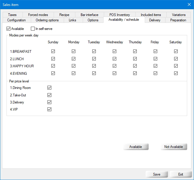 Configure the availability of the item for each mode and for each day of the week. A tick in the box means that the item will be available for that mode for that day. An empty box means that the item will be unavailable.