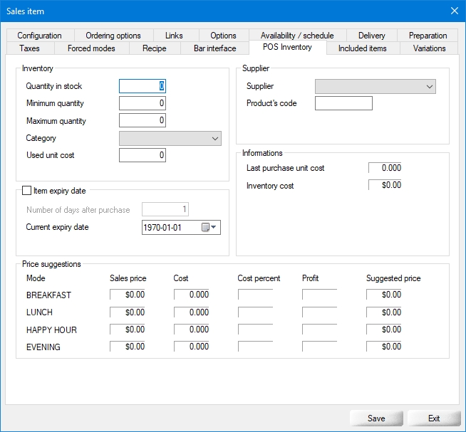 Please go through each of the following topics to learn more about all the options contained in each tab of the sales items setup: