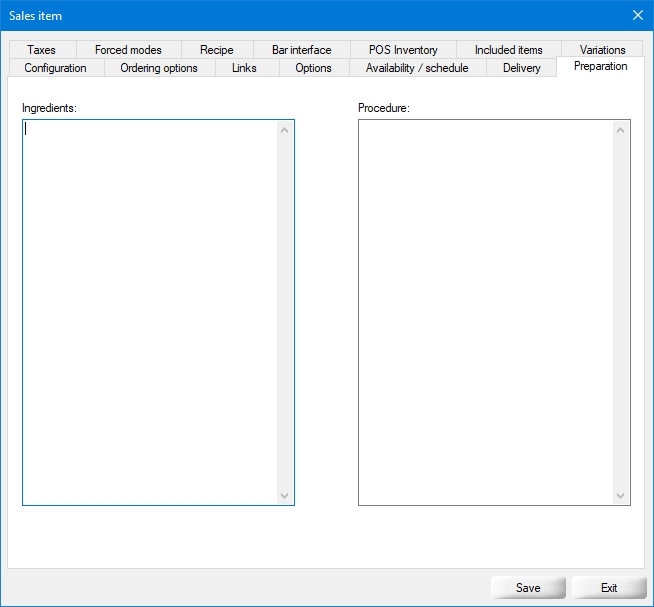 This section allows the item's preparation recipe to be written in free text. This is especially useful for cocktails or any other type of item that requires a specific setup. This information can be displayed at the POS.