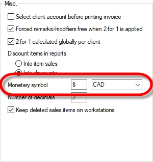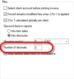 In the Misc. section of the Invoicing tab, locate the Number of Decimals field. Type any number between 0 and 2. (Japanese Yen and Chinese Yuan has 0 decimals while all North American and European currencies have 2 decimals.