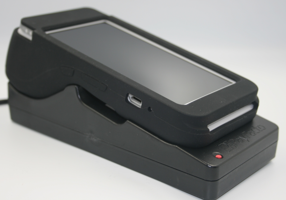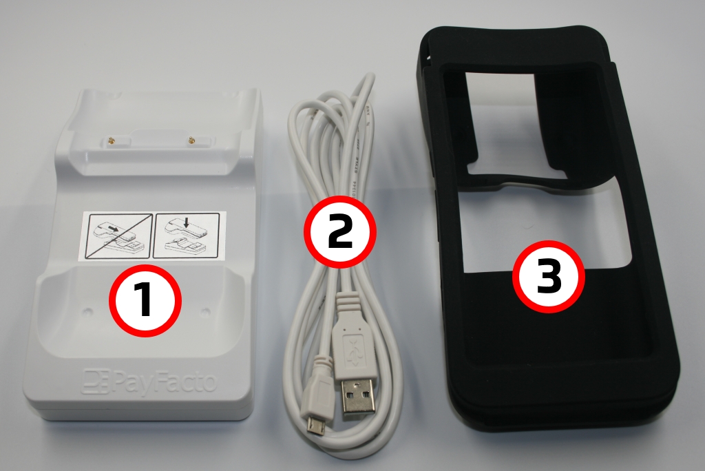 IMPORTANT! The terminals must be fitted with the PayFacto-branded silicone sleeve. The sleeve displays the PayFacto name and logo on the back. You should not use the charging base for any terminal not protected by a silicone sleeve.